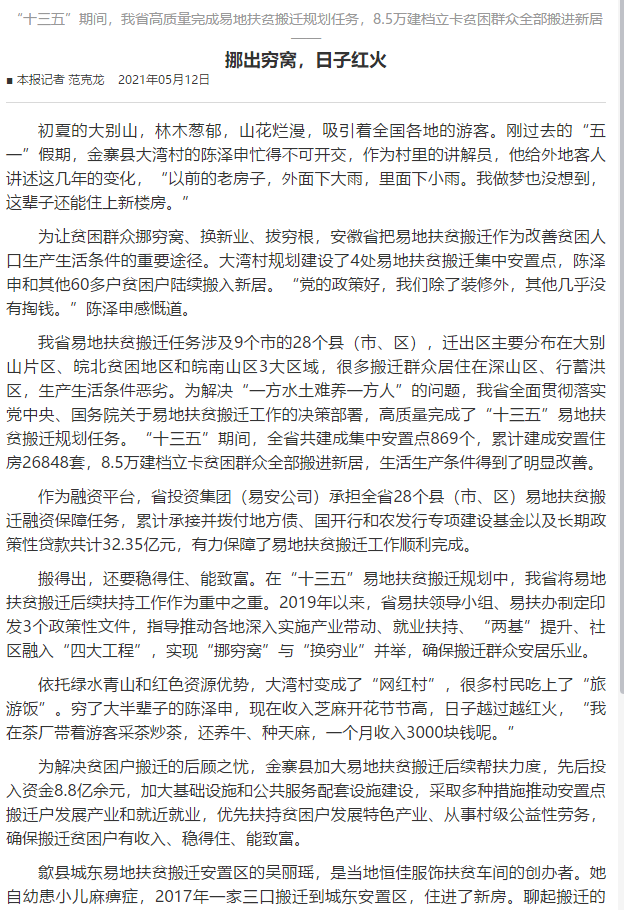 易安公司总经理张磊介绍,随着乡村振兴大幕的拉开,为了巩固拓展脱贫攻坚成果同乡村振兴有效衔接,根据省财政厅安排,省易安公司将承接1亿元易地扶贫搬迁后续扶持资金拨付至28个项目县(市、区),继续做好易地扶贫搬迁后续帮扶,谱写搬迁群众美好生活新篇章。(范克龙)
